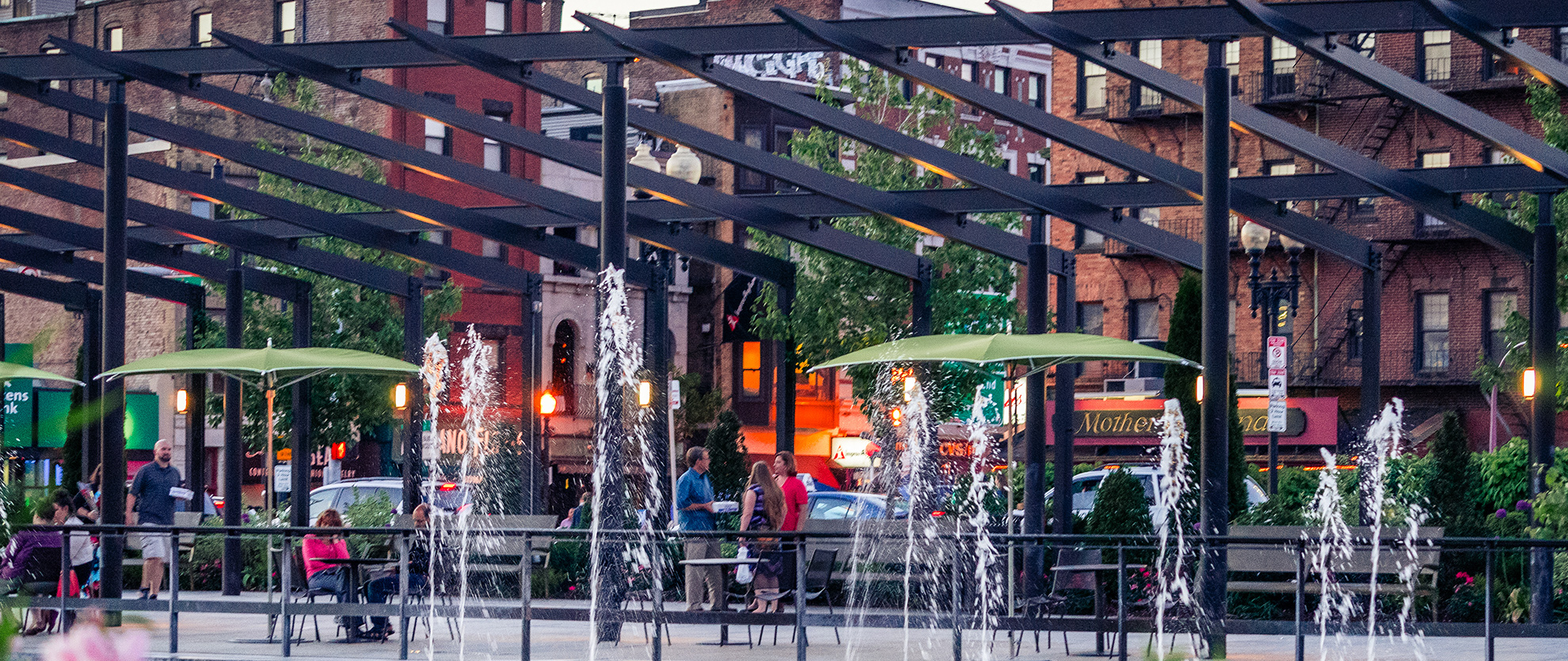 Serving as the conceptual public porch of Boston’s historic North End, three urban-scale steel pergolas elegantly frame an elevated podium under which pedestrians can sit back and relax while looking out onto the modern city.